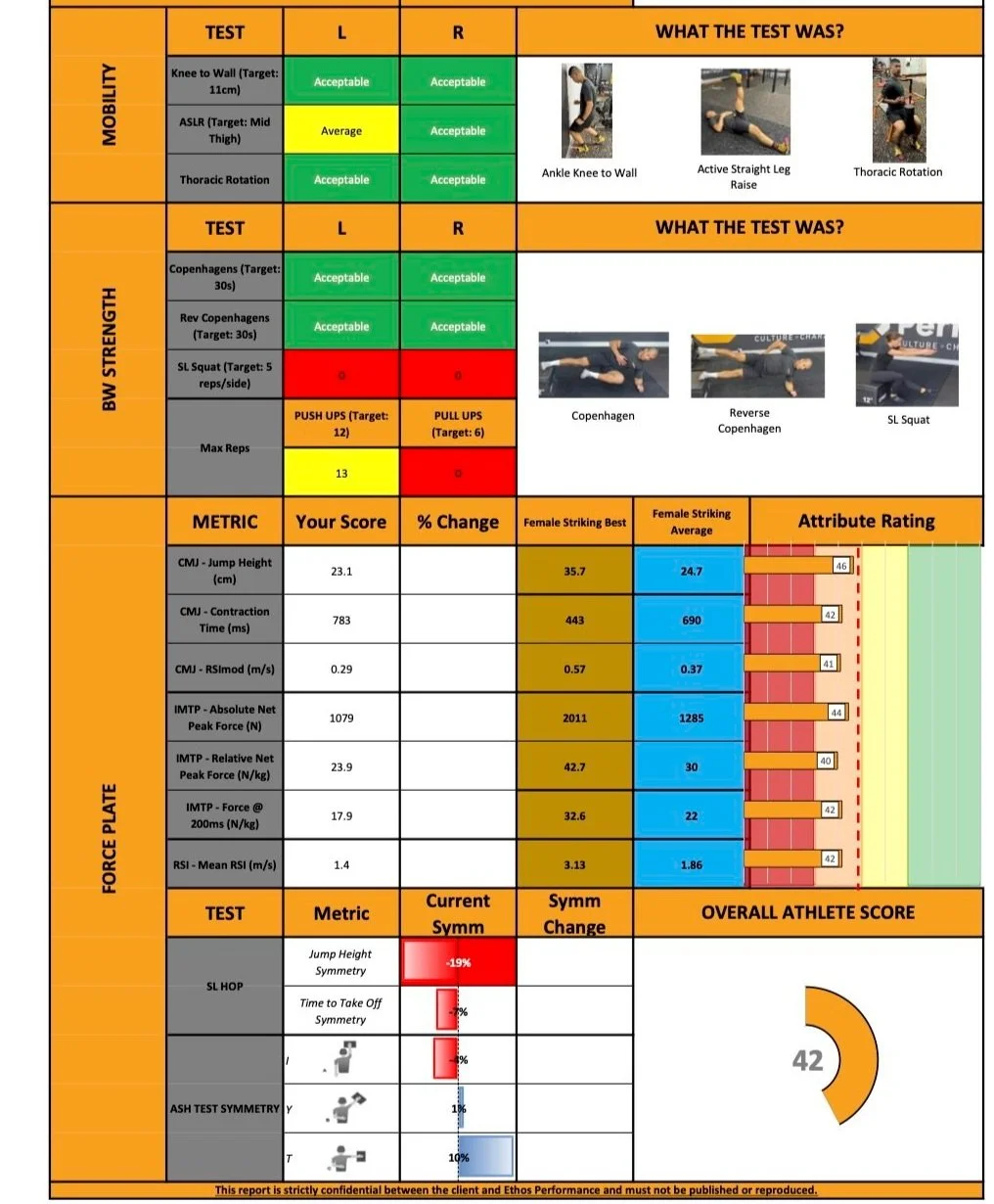 Performance Testing is an accurate way to identify your strengths and weaknesses as an athlete. The tests that we use at Ethos Performance measure your power, overall strength, reactiveness, and joint-specific strength (for example, shoulder, hip, neck) and aerobic/anaerobic fitness. This can be compiled into a report which can show you how you compare to athletes at our gym who compete in your respective sport. This report shows you what physical qualities make you a good athlete already and what you might need to address moving forward to make you the complete athlete.